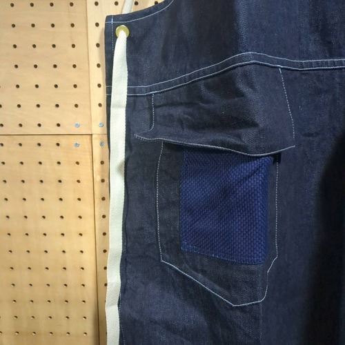 デニムの「ルートエプロン ロング」のパッチポケットには