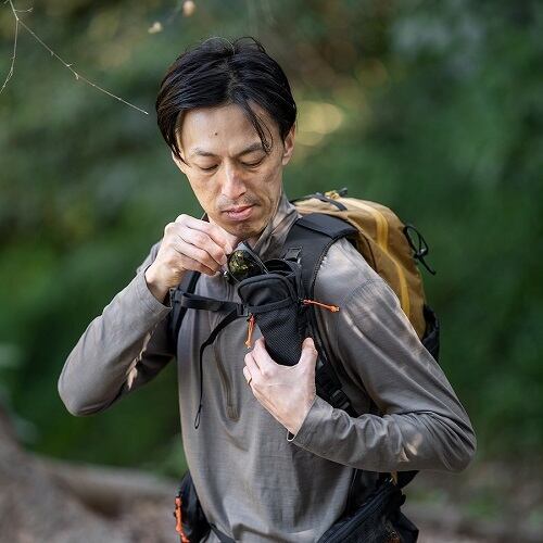 バックパックのショルダーハーネスに取り付けて使用する拡張ポケット。